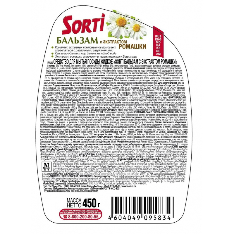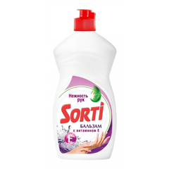 Средство для мытья посуды Sorti бальзам с витамином Е 450 мл. Назначение: современное, высокофункциональное средство с легкостью отмывает даже самые сложные загрязнения и глубоко въевшийся жир. Активные компоненты отлично справляются с жиром даже в холодной воде. Полезная добавка, входящая в состав, бережно заботится о коже Ваших рук. Оставляет на посуде только зеркальный блеск и никаких разводов. Способ применения: для мыть посуды непосредственно под струей воды нанесите 1-2 капли средства на влажную губку, протрите посуду и ополосните ее под струей воды или растворите 1 чайную ложку средства в 5 л воды, вымойте посуду, ополосните водой. При повышенной жесткости воды дозу средства увеличить. Меры предосторожности: беречь от детей. При попадании на слизистую оболочку или глаза промыть их проточной водой. Состав: 5% или более, но менее 15%: анионные ПАВ; менее 5%: неионогенные ПАВ, ароматизирующая добавка (в т.ч. гексилциннамаль), экстракт витамина Е, регулятор рН, соль этилендиаминтетрауксусной кислоты, консервант, красители. Условия хранения: хранить при температуре от -10 °С до +25 °С, в сухом помещении. Избегать попадания прямых солнечных лучей и не хранить в близи отопительных приборов. Средство замерзает, после размораживания сохраняет свои свойства. Срок годности: 24 месяца.