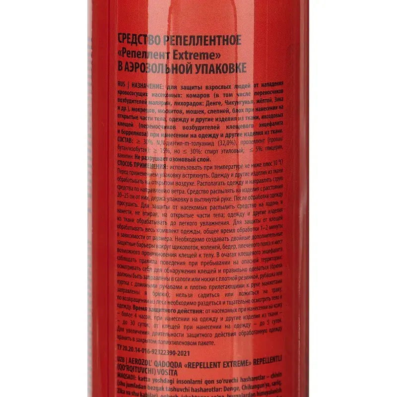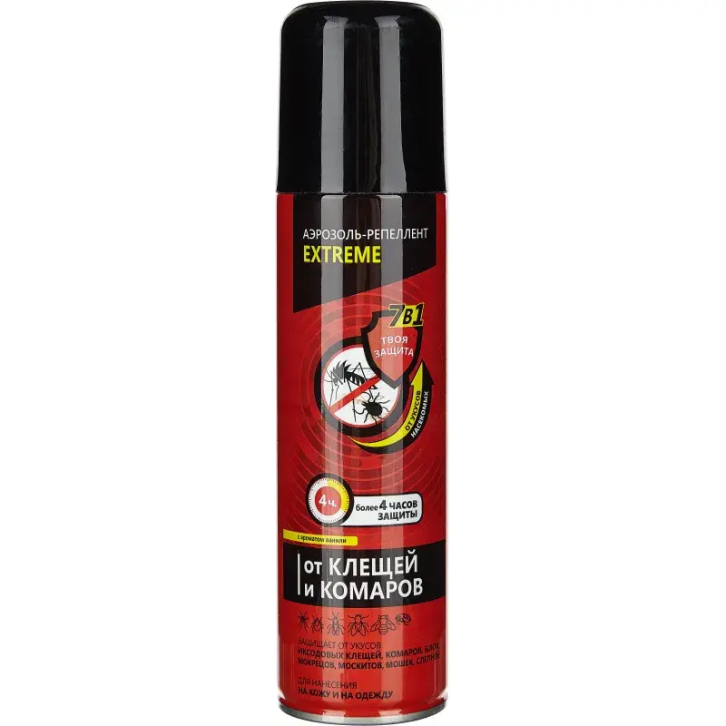 Средство от насекомых № 1 Extreme аэрозоль от клещей/комаров 150 мл Назначение: Для защиты взрослых людей от нападения кровососущих насекомых: комаров (в том числе переносчиков возбудителей малярии, лихорадок Денге, Чикунгунья, жёлтой лихорадки, Зика и др.), мокрецов, москитов, мошек, слепней, блох при нанесении на открытые части тела, одежду и другие изделия из ткани, а также от иксодовых клещей (переносчиков возбудителей клещевого энцефалита и боррелиоза). Способ применения: Использовать при температуре не ниже +10C. Перед применением упаковку встряхнуть. Одежду и другие изделия из ткани обрабатывать на открытом воздухе, располагая по направлению ветра. Средство распылять с расстояния 20-25 см, держа упаковку в вытянутой руке. После обработки одежду просушить. Для защиты от насекомых: распылить средство на ладонь и нанести, не втирая, на открытые части тела; одежду обрабатывать до лёгкого увлажнения. Для защиты от клещей: обрабатывать весь комплект одежды (1-2 минуты), уделяя особое внимание зонам вокруг щиколоток, коленей, бёдер, плечевого пояса. В очагах клещевого энцефалита обязательно: носить плотную одежду (брюки заправлять в сапоги, рубашку - в брюки), избегать контакта с травой, регулярно осматривать одежду, после возвращения тщательно проверять тело и одежду. Время защитного действия от насекомых: на коже - более 4 часов, на одежде - до 30 суток. От клещей: на одежде - до 5 суток. Для продления эффекта хранить обработанную одежду в закрытом полиэтиленовом пакете. Меры предосторожности: Осторожно! Воспламеняющийся аэрозоль! Не распылять вблизи открытого огня и нагретых поверхностей. Беречь от нагрева выше +40C. Баллон под давлением - не разбирать. Противопоказано: детям до 18 лет, беременным, кормящим, лицам с кожными заболеваниями. Избегать попадания в глаза, на повреждённую кожу и слизистые. После нанесения вымыть руки. Максимальная норма: 300 мл/сутки на человека. Не носить влажную после обработки одежду. Состав: N,N-диэтил-m-толуамид (32,0%), пропеллент (пропан/бутан/изобутан, 50,0%), спирт этиловый или изопропиловый (15,9%), глицерин, ванилин. Не разрушает озоновый слой. Условия хранения: Хранить при температуре от −20C до +40C, отдельно от лекарственных средств и пищевых продуктов, в недоступном для детей месте. После использования или по истечении срока годности средство и упаковку утилизируют как бытовые отходы. Срок годности: 3 года.