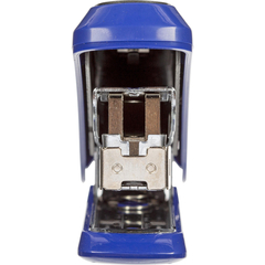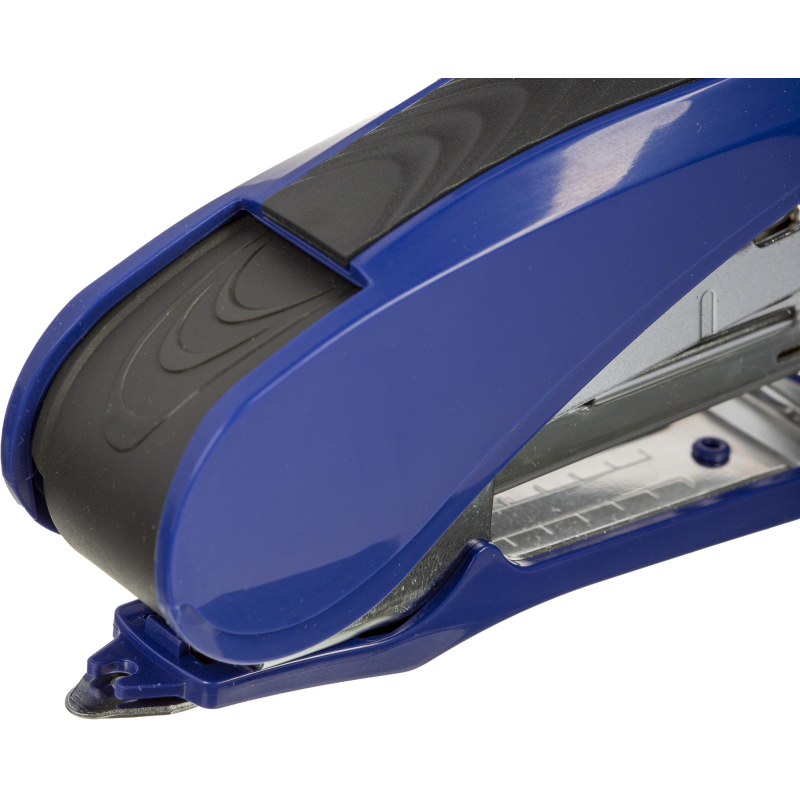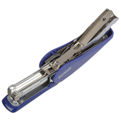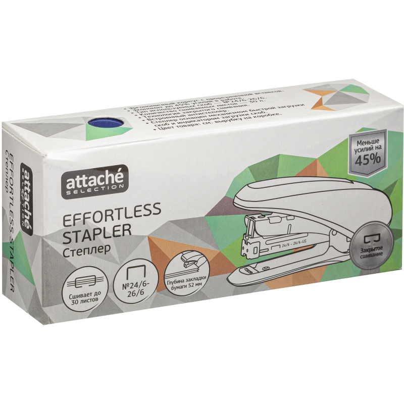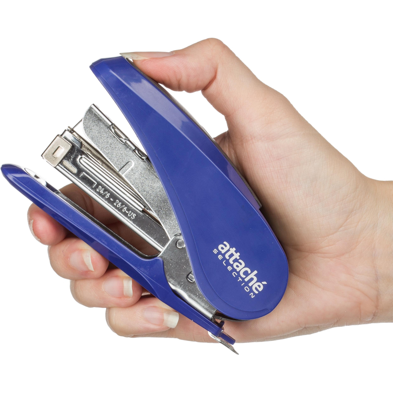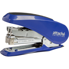 Степлер Attache Selection выполнен в металлическом корпусе синего цвета. Рабочие компоненты изготовлены из высококачественной стали. Детали корпуса выполнены из ударопрочного и износоустойчивого ABS-пластика. Степлер комфортно использовать за счет противоскользящей вставки на верхней части корпуса. Степлер совместим со скобами №24/6-26/6, одновременно сшивая до 30 листов бумаги плотностью до 80 г/кв.м. Благодаря технологии Less Effort при сшивании прилагается до 45% меньше усилий. Модель оснащена антистеплером, механизмом быстрой загрузки скоб и индикатором наполненности лотка для скоб. Степлер скрепляет бумагу закрытым типом сшивания, при котором ножки скобы загибаются внутрь. Это дает возможность надежно хранить сшитые документы на протяжении длительного времени. Вместимость лотка для скоб: 50 скоб размером №24/6 или 100 скоб размером №26/6. Глубина закладки бумаги: 52 мм.