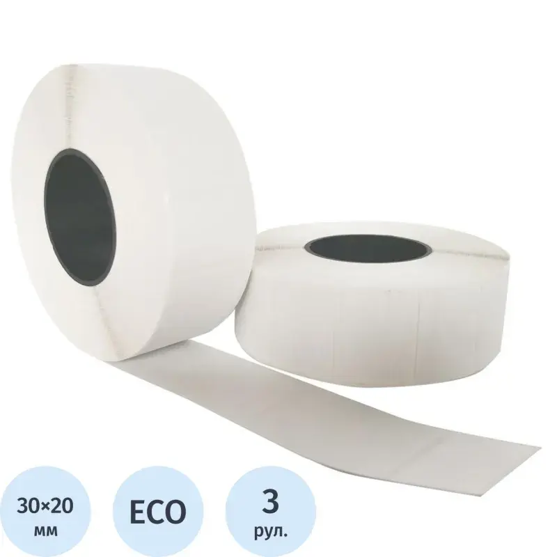 Термоэтикетка размером 30×20 мм без печати белого цвета изготовлены из материала Thermal ECO (ЭКО) ведущих производителей. Рулон с втулкой диаметром 40 мм содержит 2000 плюс-минус 5 этикеток. Рулоны упакованы в термоупаковку по 3 шт (в спайки) и в компактные гофрокороба по 24 спайки (по 72 рулона в коробке). Самоклеящиеся термоэтикетки применяются для нанесения веса, штрихкодов, цен и другой информации, маркировки товаров недлительного хранения. Потенциальные потребители — супермаркеты, производство, центры техобслуживания кассовых аппаратов, снабжающие компании, компании по поставке упаковочных материалов, предприятия, занимающиеся фасовкой продукции и т. д.Термоэтикетки предназначены для печати на термопринтерах в режиме прямой термопечати (Direct Termal, печать с помощью термоголовки).
