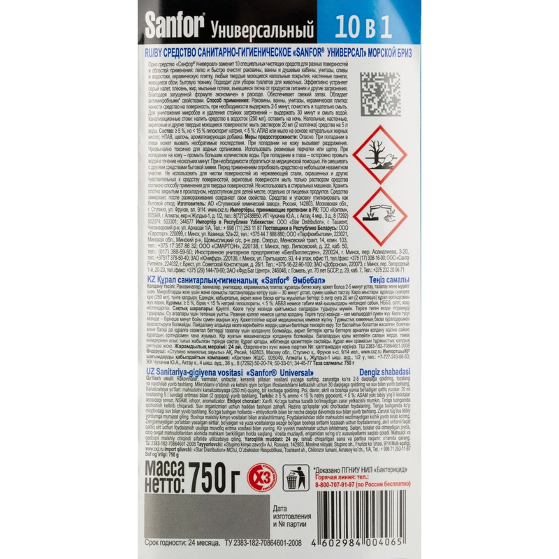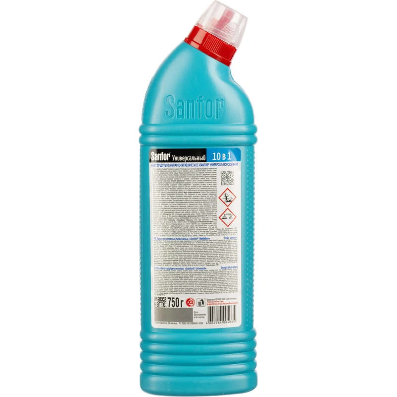 Одно средство Санфор Универсал заменит 10 специальных чистящих средств для разных поверхностей и областей применения: легко и быстро отчистит раковины, ванны и душевые кабины, унитазы, сливы и водостоки, керамическую плитку, любые твердые моющиеся напольные покрытия, настенные панели, моющиеся обои, бытовую технику. Подходит для уборки и дезинфекции туалетов для животных. Эффективно устраняет серый налет, плесень, жир, мыльные потеки, въевшиеся пятна от продуктов питания и другие загрязнения. Благодаря загущенной формуле экономичен в расходе. Обеспечивает свежий запах. Обладает антимикробными свойствами.